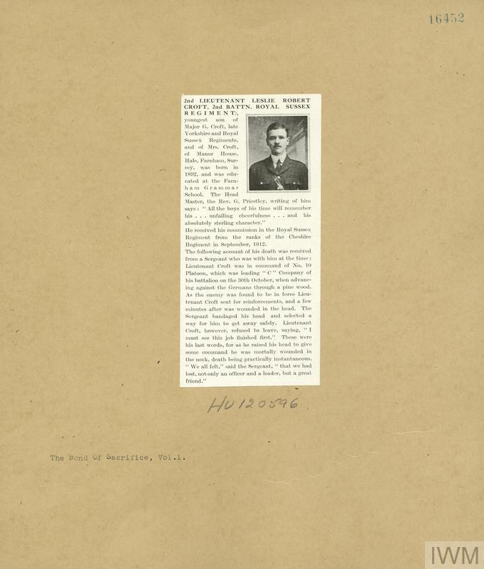 Second Lieutenant Leslie Robert Croft. Unit: C Company, 2nd Battalion, Royal Sussex Regiment. Death: 30 October 1914 Killed in action Western Front