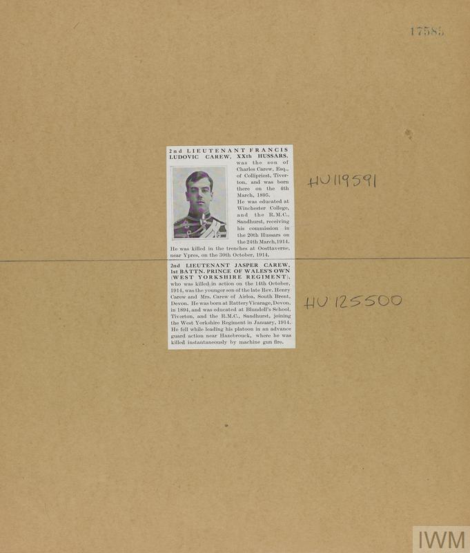 Second Lieutenant Francis Ludovic Carew. Unit: 20th Hussars. Death: 30 October 1914 Killed in action Oosttaverne near Ypres Western Front