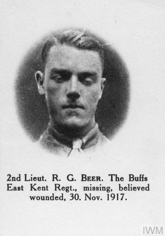 Second Lieutenant Robert Gerald Beer. Unit: 4th Battalion, attached to 6th Battalion, The Buffs (East Kent Regiment). Death: 30 November 1917 Western Front. Son of Robert and Lettice Beer, of 2, Hayes Rd., Bromley, Kent.