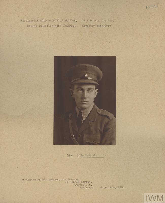 Second Lieutenant Harold Broughton Broster. Unit: 11th Battalion, King's Royal Rifle Corps. Death: 30 November 1917 Cambrai Western Front
