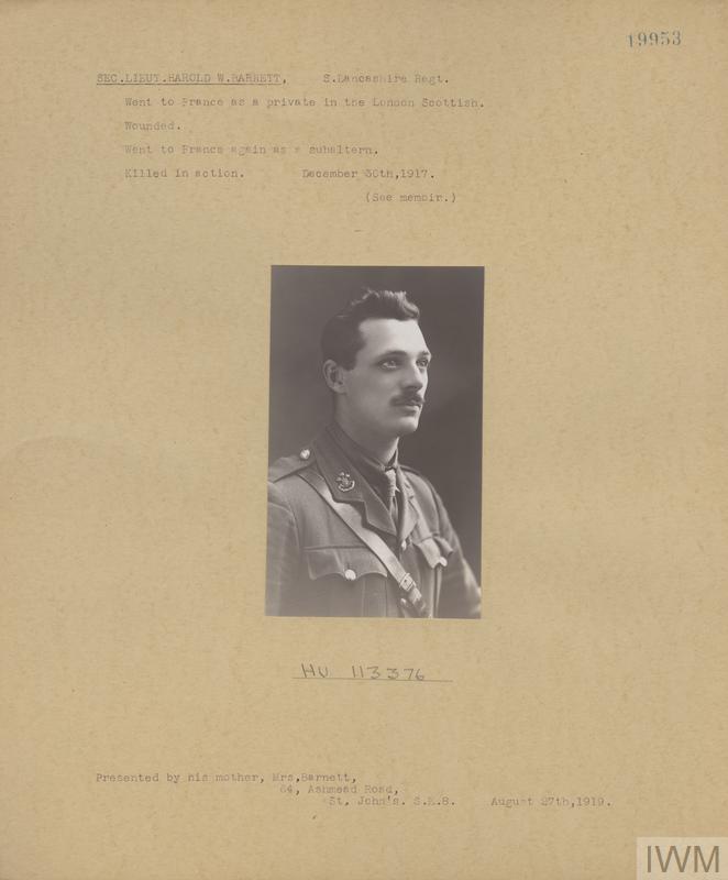 Second Lieutenant Harold Walter Barnett. Unit: 5th Battalion, South Lancashire Regiment. Death: 30 December 1917