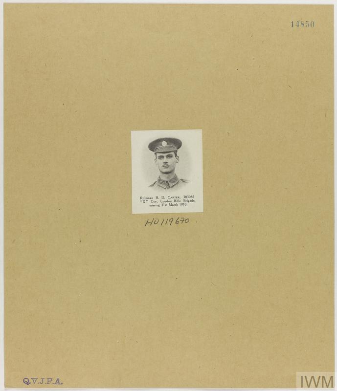 Rifleman Reginald Denegri Carter 303085. Unit: D Company, 5th Battalion, London Regiment (London Rifle Brigade). Death: 31 March 1918 Missing in action
