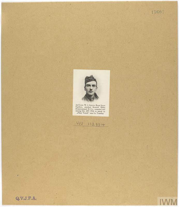 Second Lieutenant William John Angus. Unit: Royal Scots Fusiliers, attached to "D" Company, 1st Battalion, Cameronians (Scottish Rifles). Death: 31 October 1916, missing, ‘Hazy Trench', Le Transloy, Somme, Western Front. Commemorated on the Thiepval Mem