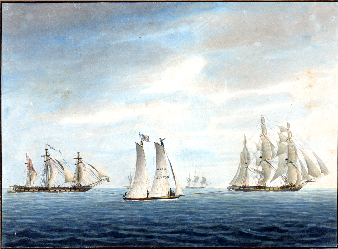 No 2. Dec 31st 1794. The Cleopatra towing the Thetis towards the Chesapeake. Lynx and Thisbe attending... A Virginian pilot boat the Sally of Norfolk in the foreground. Watercolour depicting the 'Cleopatra' (right) towing the 'Thetis'