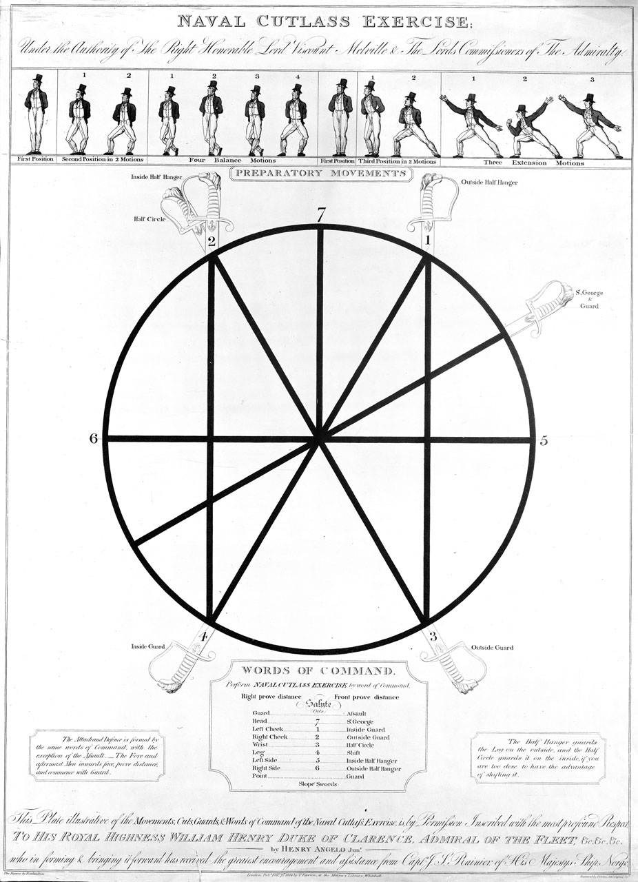 Naval Cutlass Exercise including Prepatory Movements and Words of Command. Hand-coloured. An etching showing naval cutlass exercises, including the positions of the swordsman. The words of command and different methods of defence and attack are included o