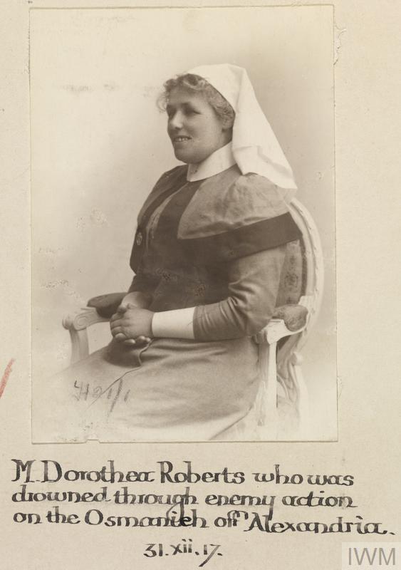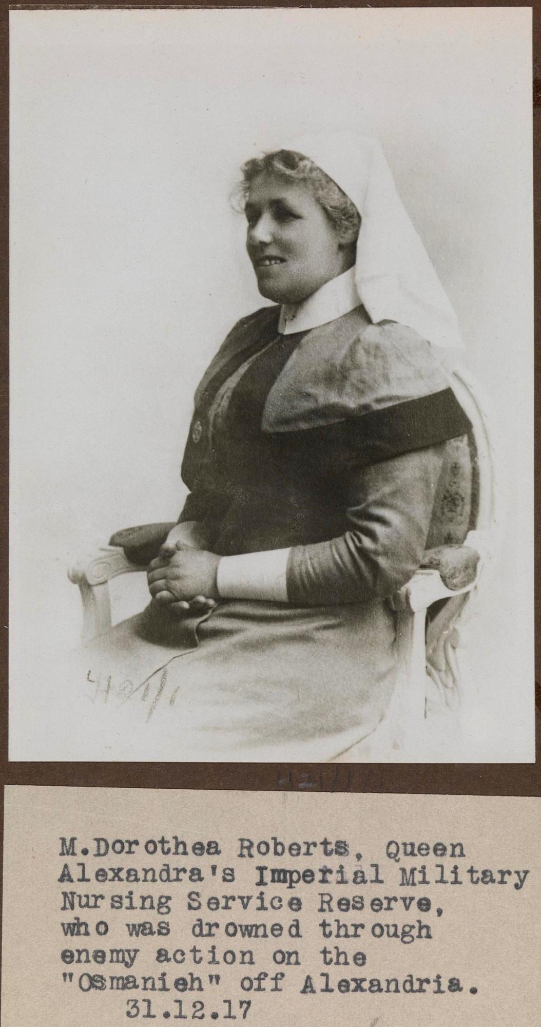 Staff Nurse M Dorothea Roberts, Queen Alexandra's Imperial Military Nursing Service Reserve. Drowned in the Mediterranean when the Osmanieh was torpedoed 31 December 1917.