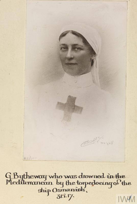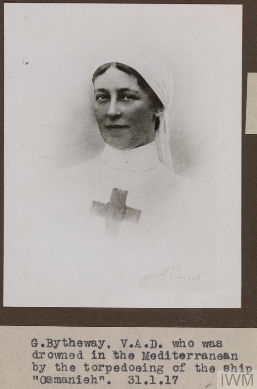 Nurse G Bytheway, Voluntary Aid Detachments. Drowned in the Mediterranean when the Osmanieh was torpedoed 31 December 1917.