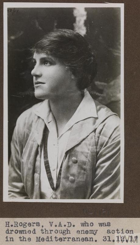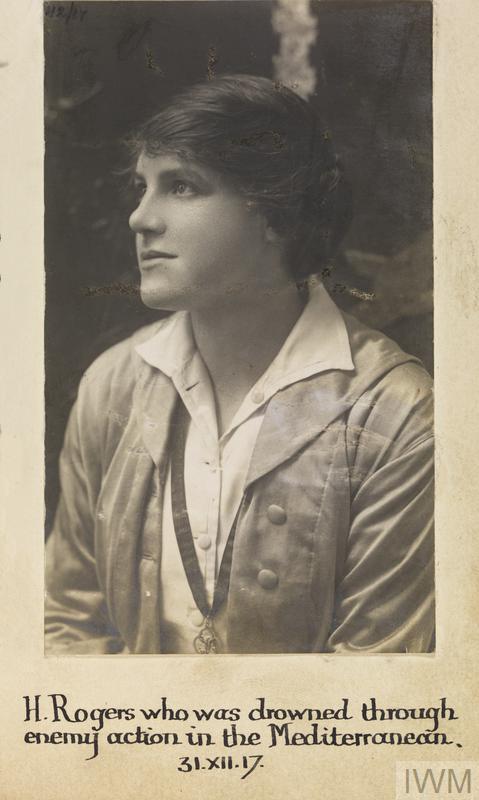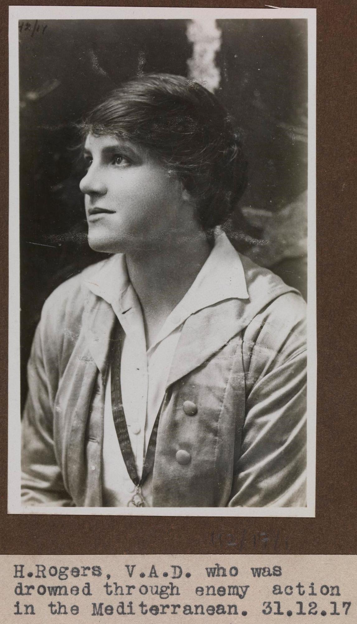 Nurse Hermione A Rogers, Voluntary Aid Detachments. Drowned in the Mediterranean when the Osmanieh was torpedoed 31 December 1917.