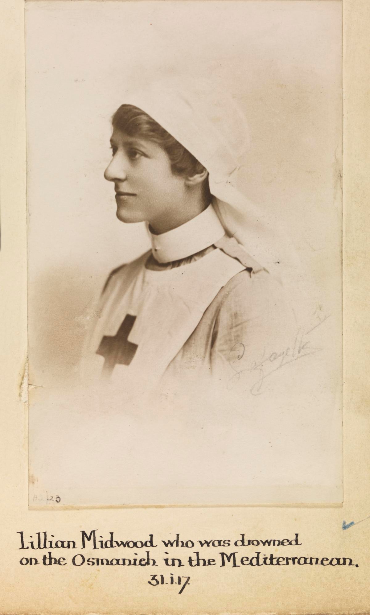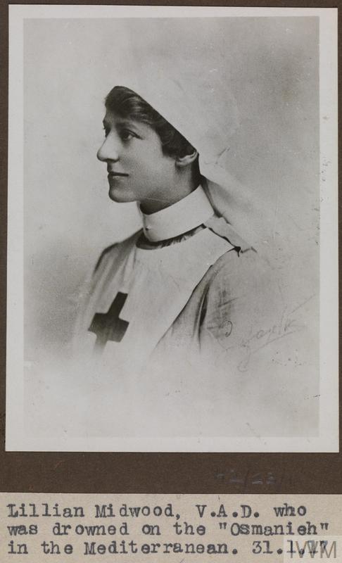 Lillian Midwood, Voluntary Aid Detachments. Drowned in the Mediterranean when the Osmanieh was torpedoed 31 December 1917.