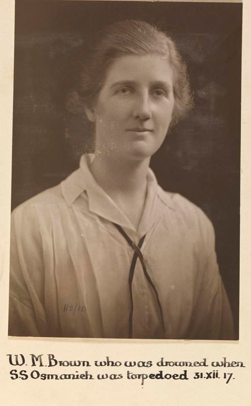 Sister W M Brown, Voluntary Aid Detachments. Drowned in the Mediterranean when the Osmanieh was torpedoed 31 December 1917.