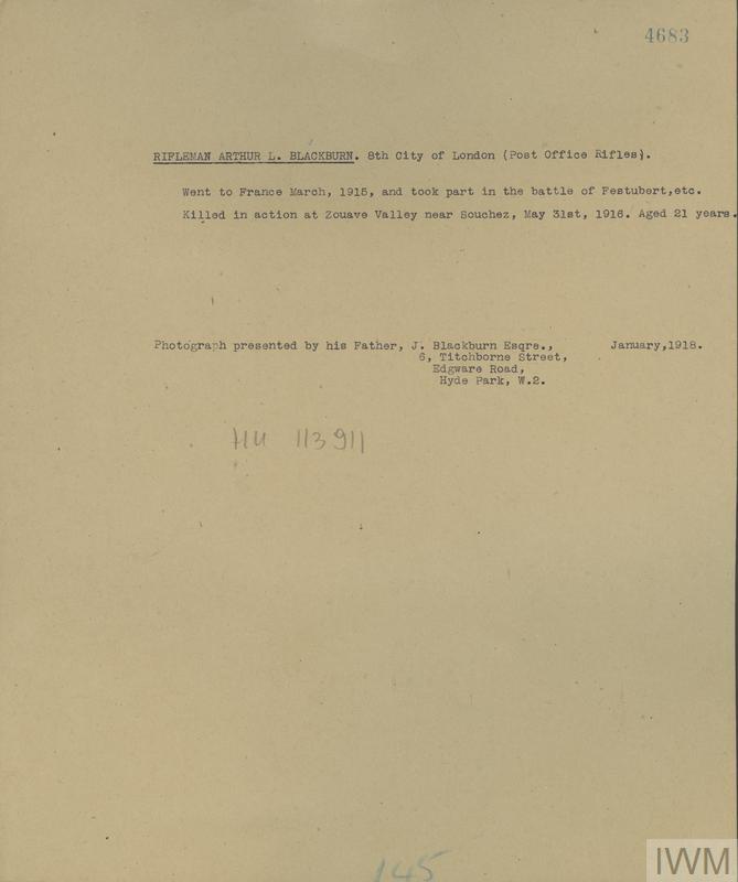 Rifleman Arthur L Blackburn 1658. Unit: 8th Battalion, City of London (Post Office Rifles). Death: 31 May 1916 Zouave Valley near Souchez Western Front