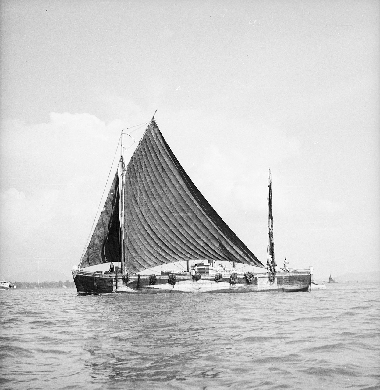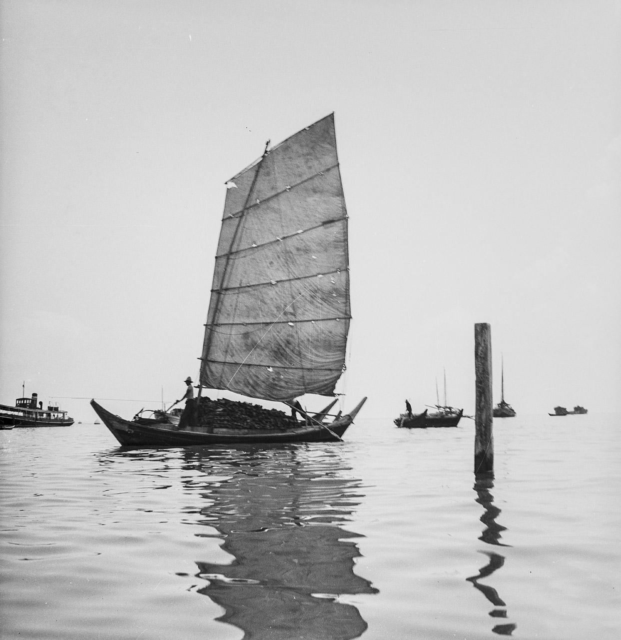 A port broadside view of the trader type junk P.194 under sail at Penang. A slightly distant port broadside view of a two masted trader type junk under sail at Penang.  She has a raking stem, an occuli on her bow and an awning rigged aft.  She has two lug