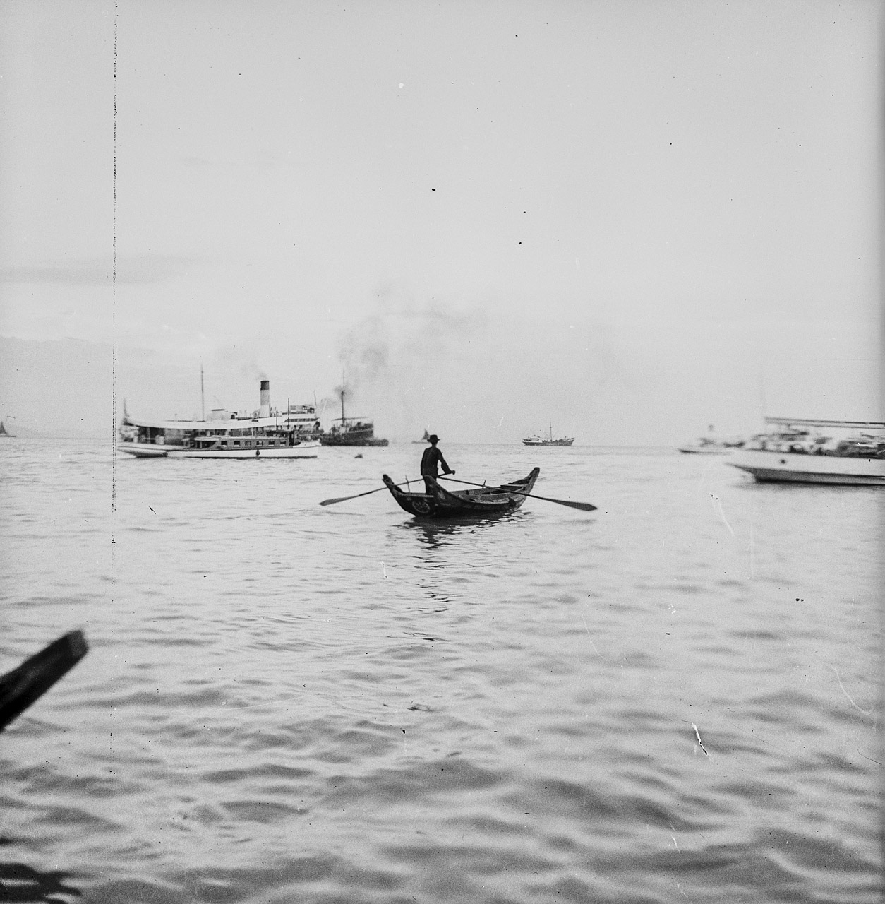 A sampan being skulled in Penang harbour. A distant starboard quarter view of a sampan being skulled by a standing man in Penang harbour.  The boat is not laden.  Local and coastal steamships are in the background, including a ship owned by the Straits St