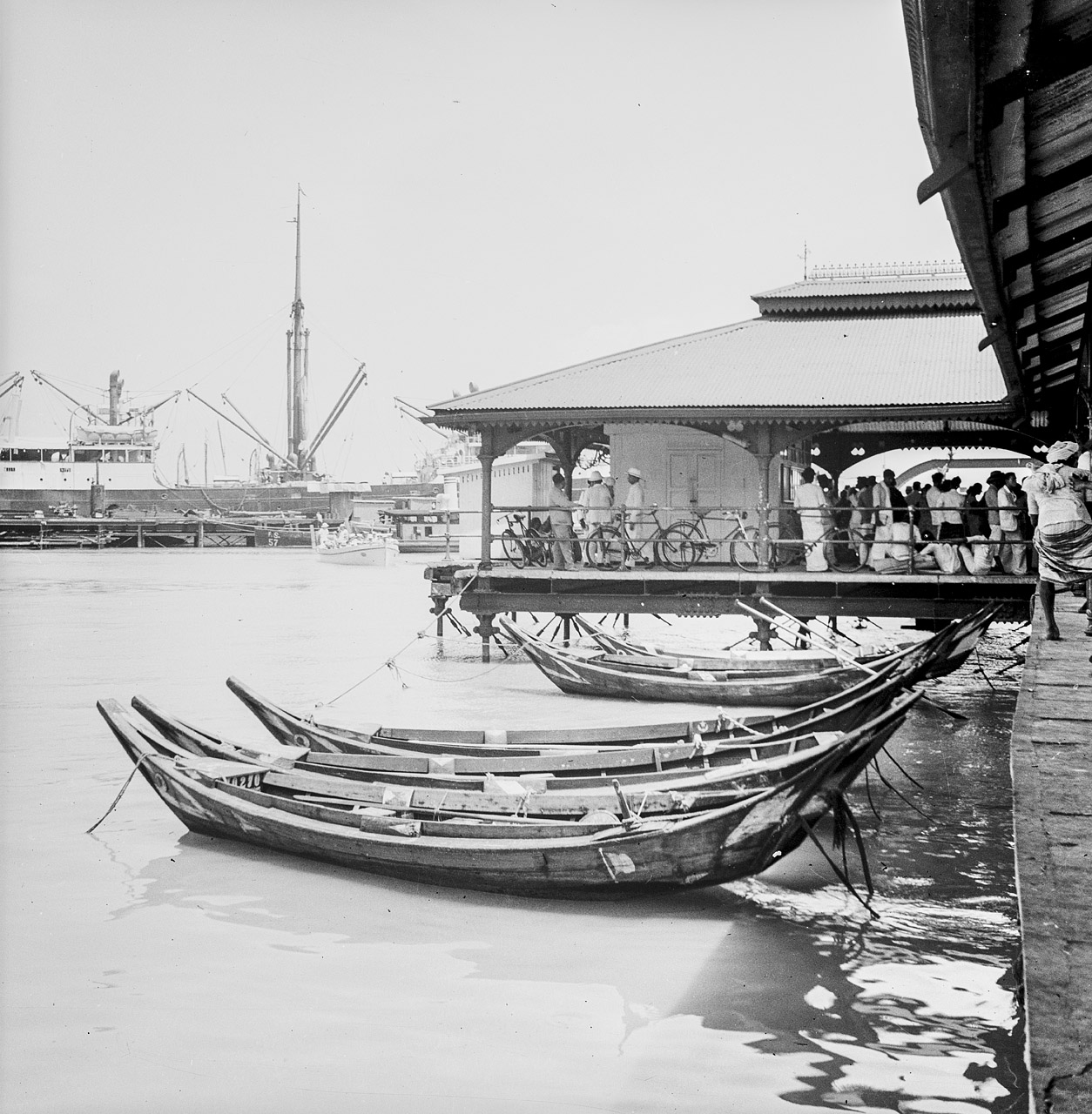Sampans in the sampan harbour near the FMS Railway Station pier at Penang. Five sampans moored stern-on to the quay in the sampan harbour near the FMS Railway station pier at Penang.  The boats all have occuli on their bow.  People and bicycles are on the