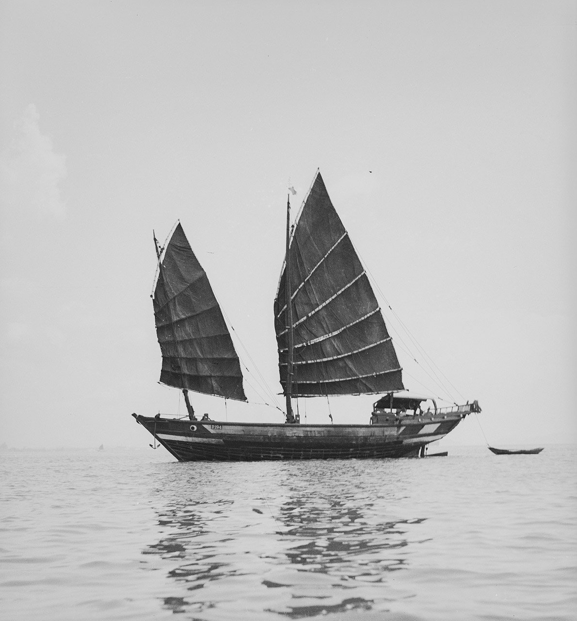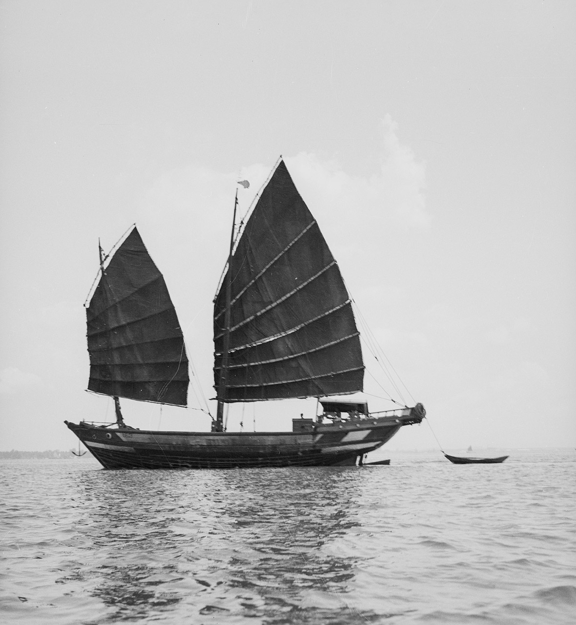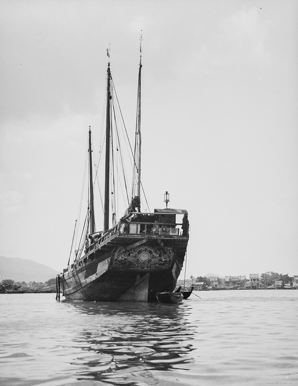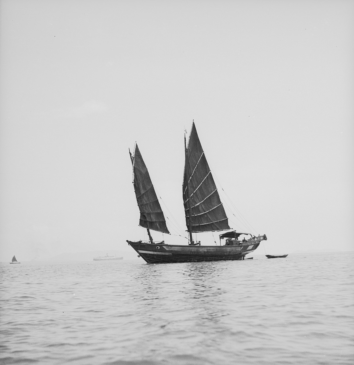 A port beam view of the two masted trading junk P.194 at Penang. A slightly distant port broadside view of a two masted trader type junk under sail at Penang.  She has a raking stem, an occuli on her bow and an awning rigged aft.  She has two lug sails se