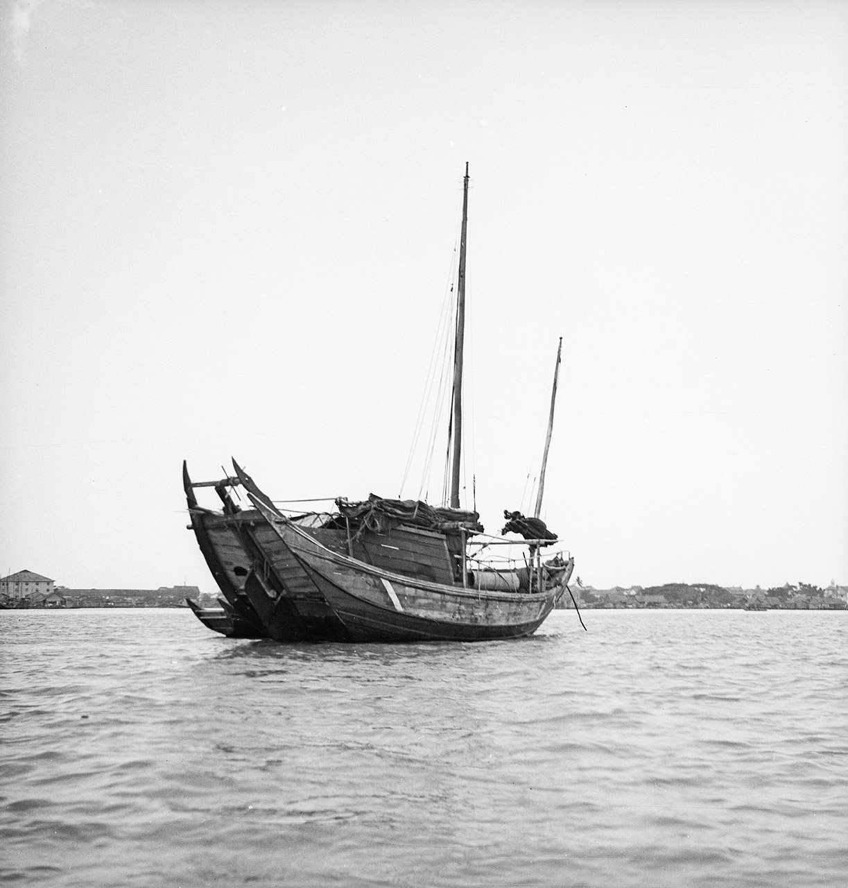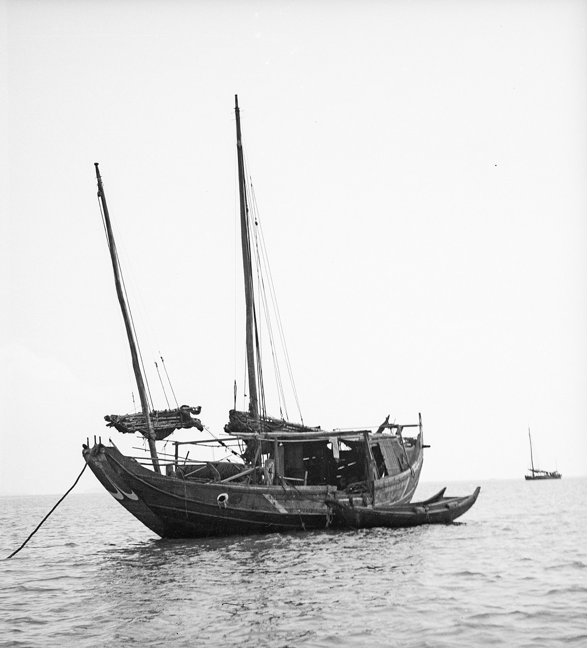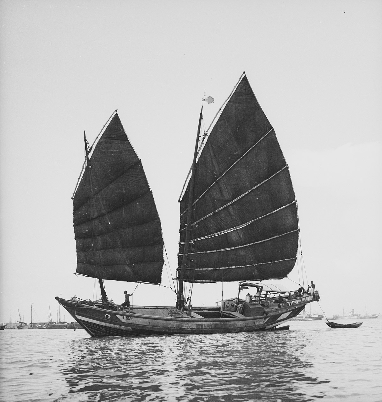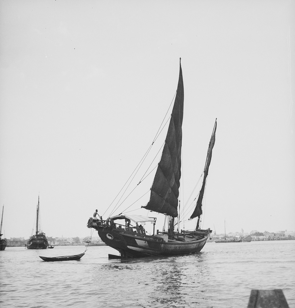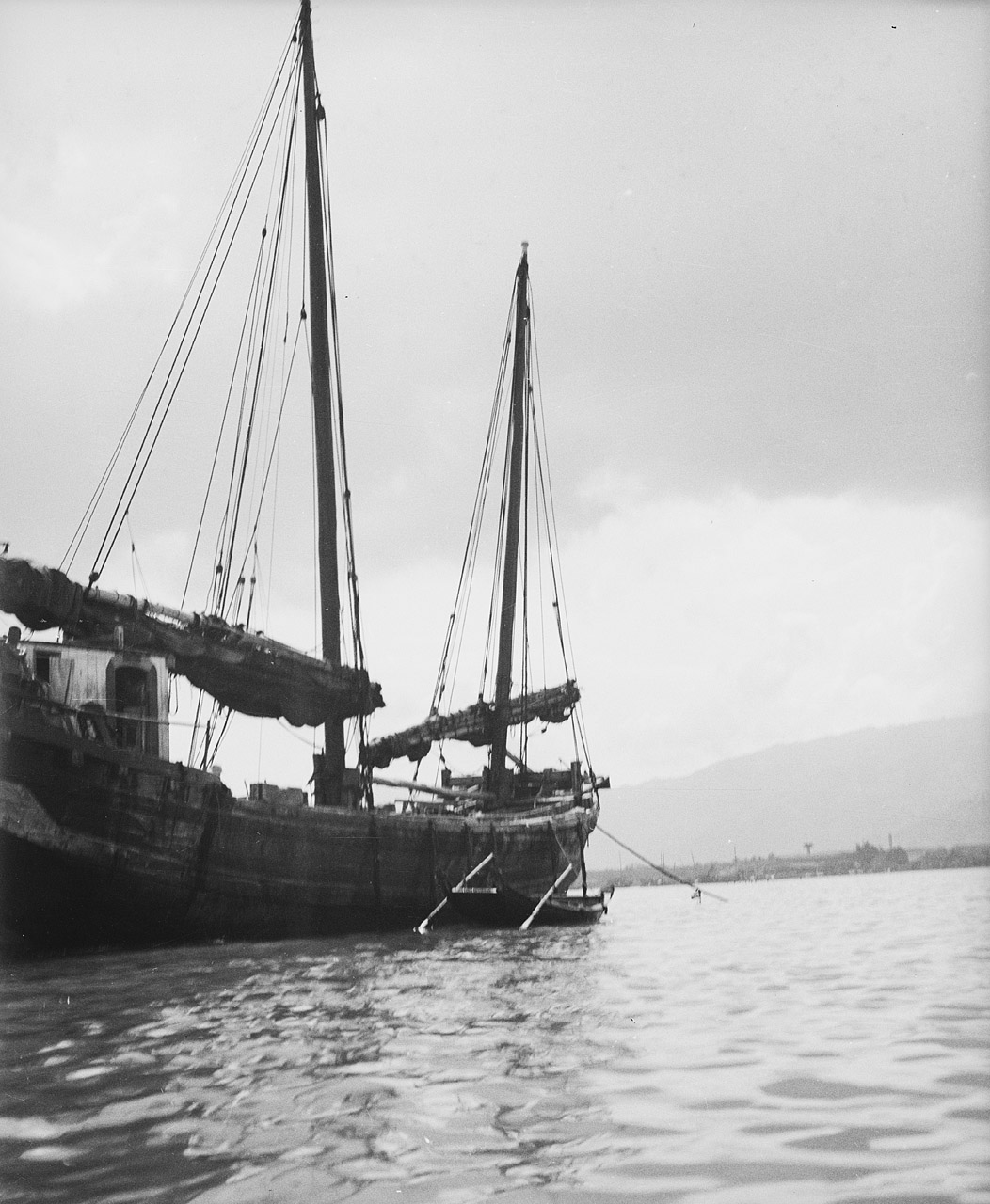 A port beam view of the two masted trading junk P.194 at Penang. A slightly distant port broadside view of a two masted trader type junk under sail at Penang.  She has a raking stem, an occuli on her bow and an awning rigged aft.  She has two lug sails se