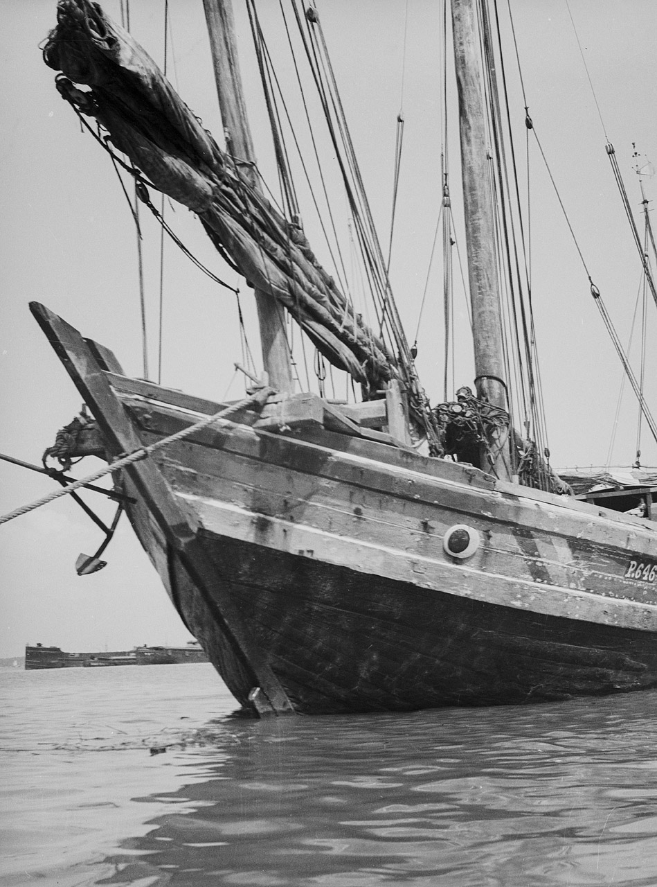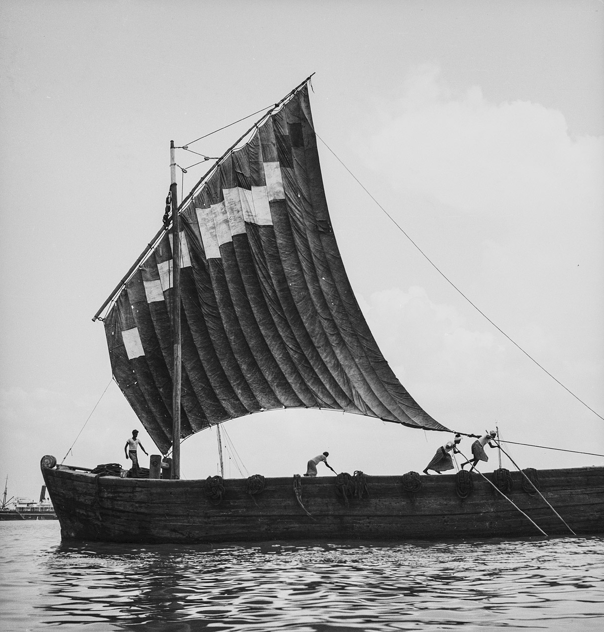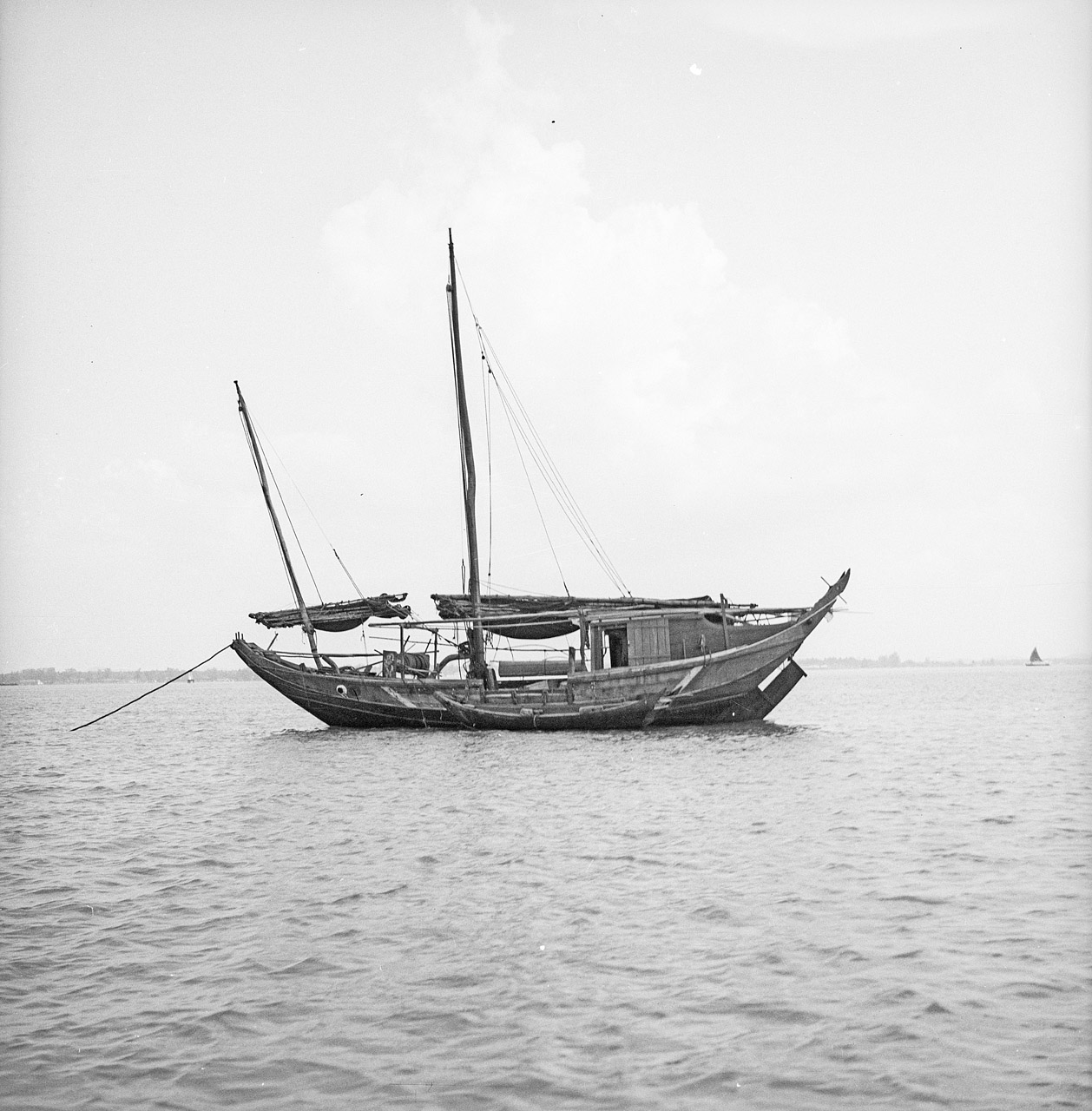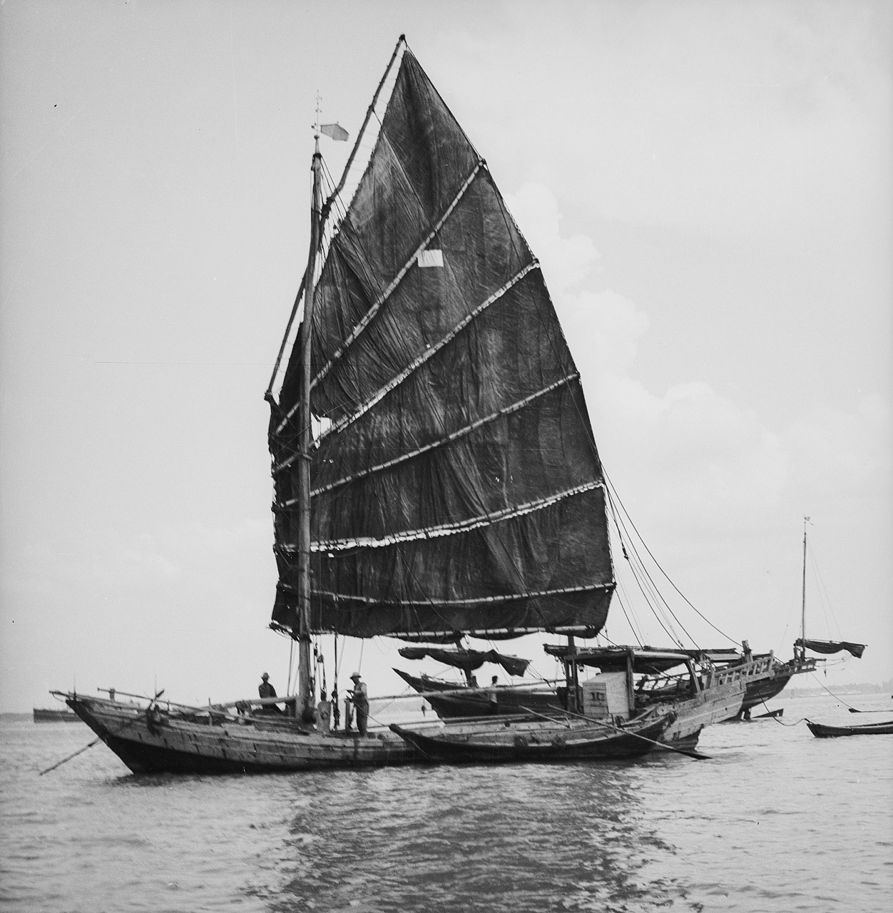 A port beam view of the two masted trading junk P.194 at Penang. A slightly distant port broadside view of a two masted trader type junk under sail at Penang.  She has a raking stem, an occuli on her bow and an awning rigged aft.  She has two lug sails se