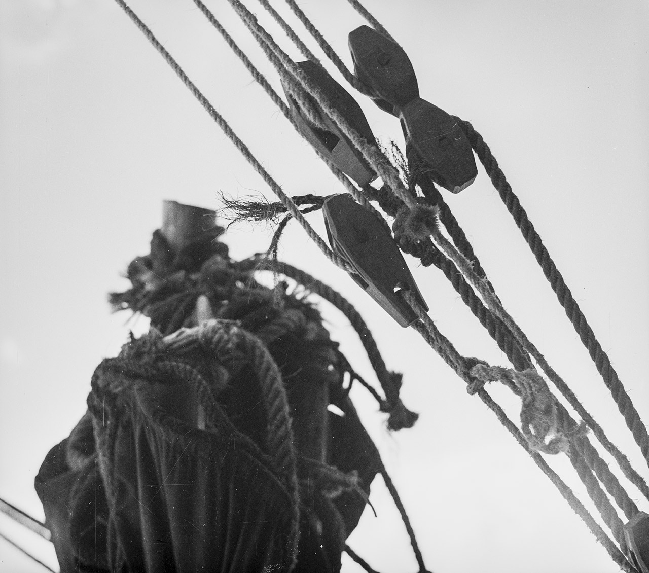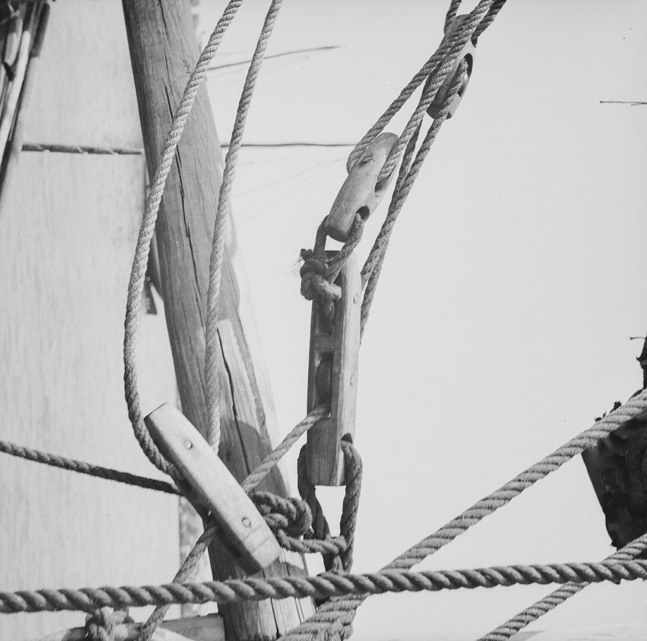 Running rigging on a fisher junk at Penang. A close view of some running rigging on board a fisher junk at Penang.  The photographer is looking up from the deck showing the end of a stowed lug sail. In the rigging are two single sheave blocks and one twin