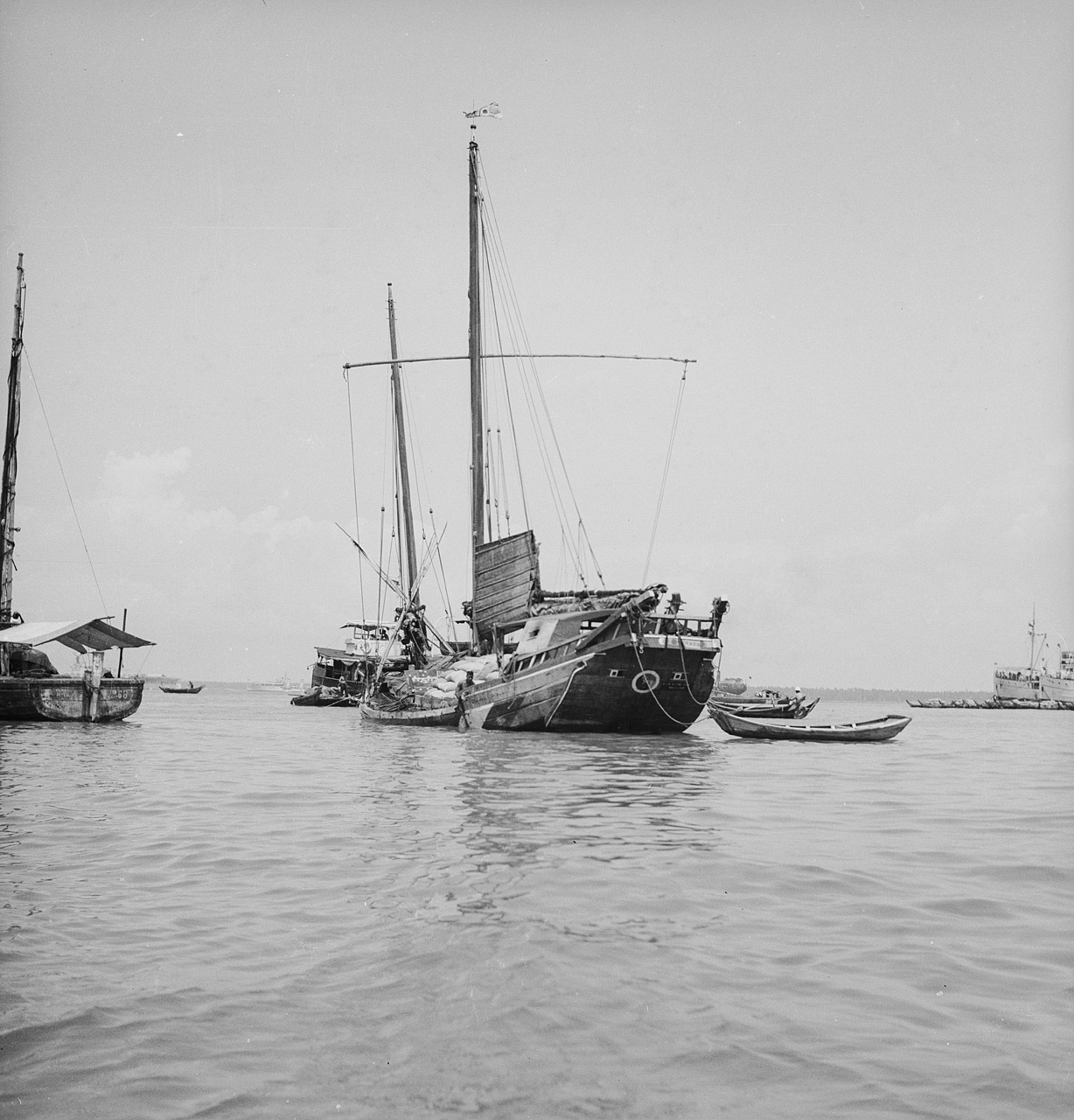 A ketch rigged lighter under sail at Penang. A slightly distant port bow view, taken from wide off the bow, of a two masted lighter under sail at Penang.  She has a ketch rig and she has set a staysail and a loose-footed mainsail.  Her mizzen sail is stow