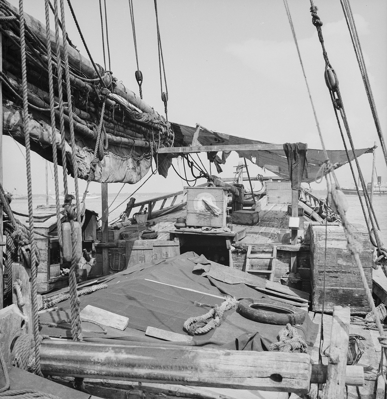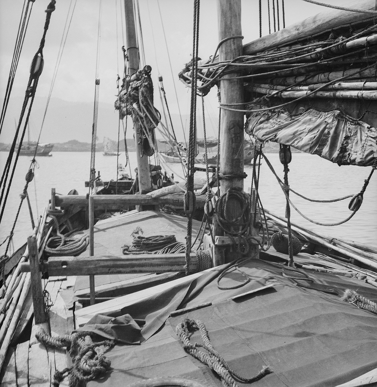 On board a two masted trader type junk which is anchored at Penang. On board a two masted trading junk which is anchored in Penang harbour.  The photographer is on the port side of the deck abreast the forward hold looking aft.  The after hold has tarpaul