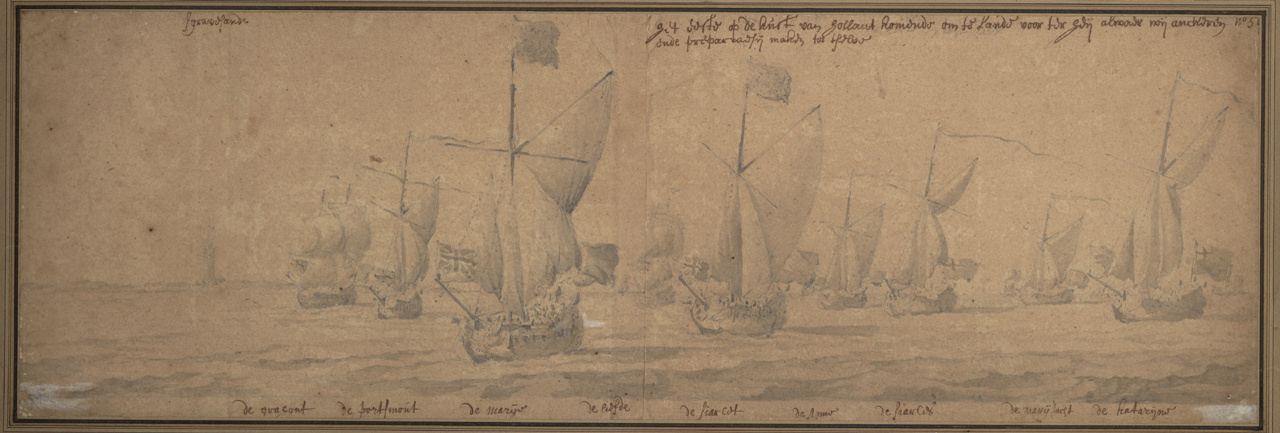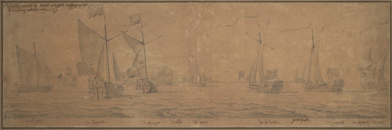 The Prince of Orange and Princess Mary going ashore at Ter Heide, 9 December 1677. Van de Velde produced a series of at least 56 drawings of the journey made by the Prince and Princess illustrating various stages of their journey. Most of them are in the
