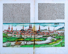 The Nuremberg Chronicle by Hartmann Schedel. Hand-colouring incomplete.; Text in Latin.
