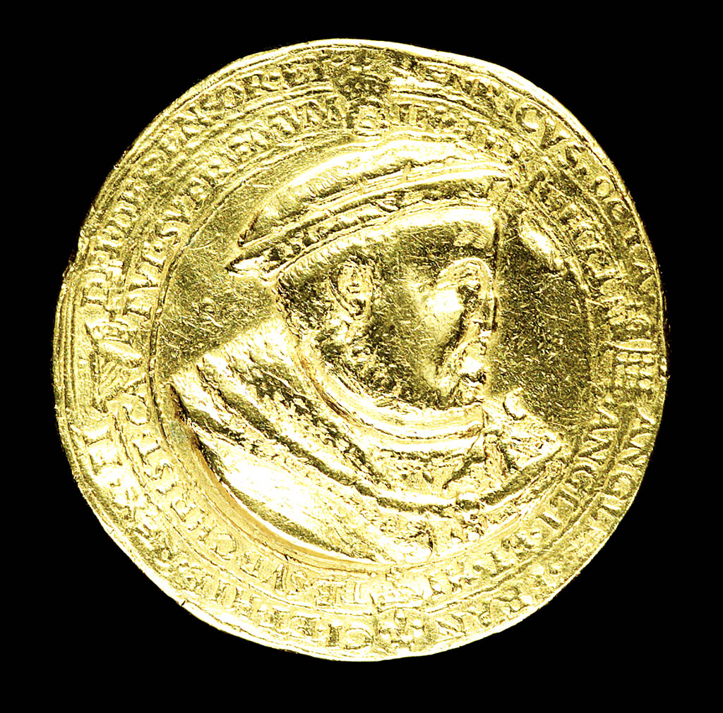 Medal commemorating the supremacy of the church, 1545. Medal commemorating the supremacy of the church, 1545. Obverse: Bust of Henry VIII (right), on his head a cap decorated with jewels, his robe ermined, a splendid collar of rubies over his shoulders. L