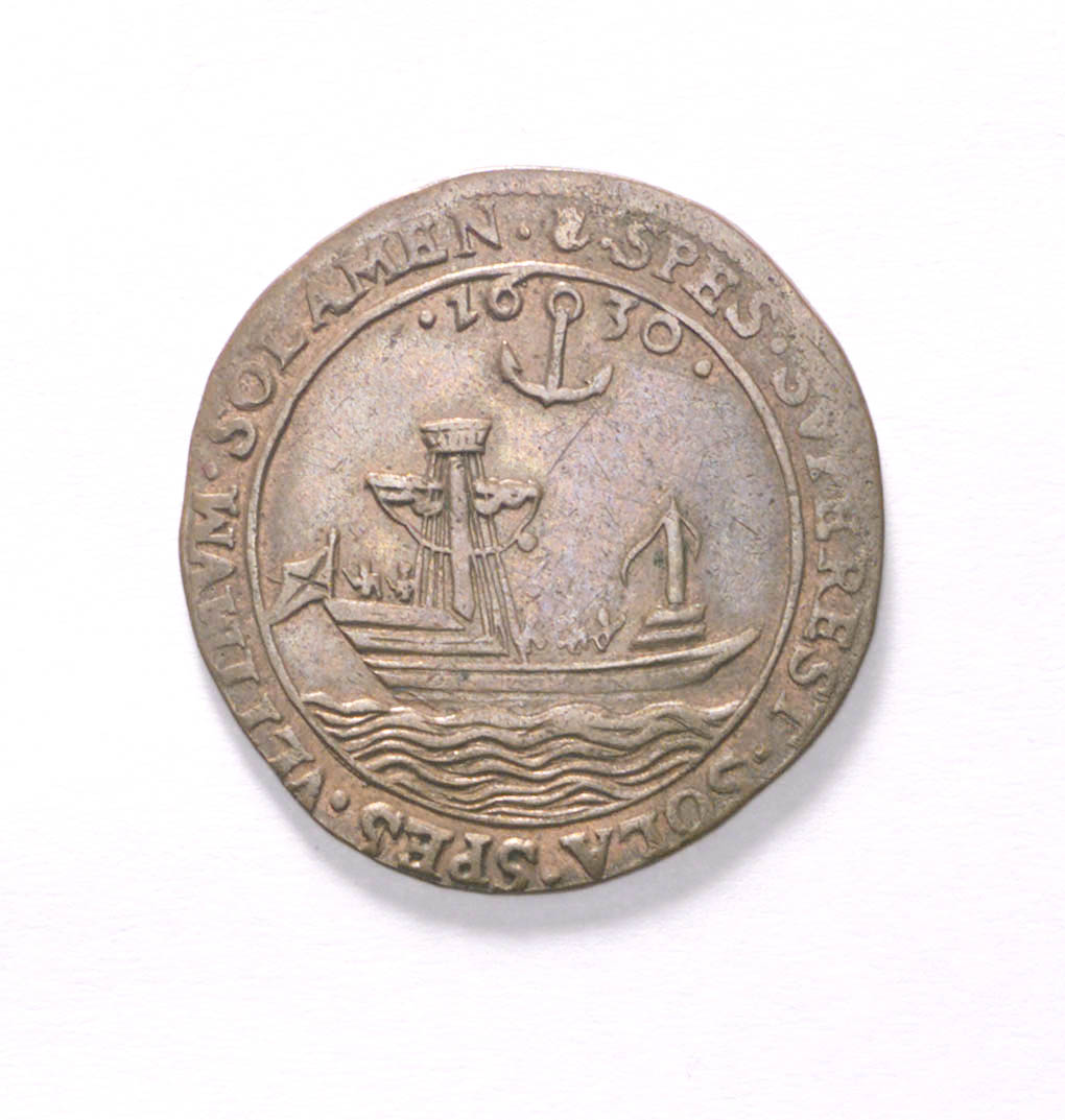 Counter commemorating hopes for peace, 1630. Counter commemorating hopes for peace, 1630. Obverse: A disabled ship of state anchored. Legend: 'SPES . SVPEREST . SOLA . SPES . VLTIMVM . SOLAMEN'. Inscription: '1603'. Reverse: The crowne