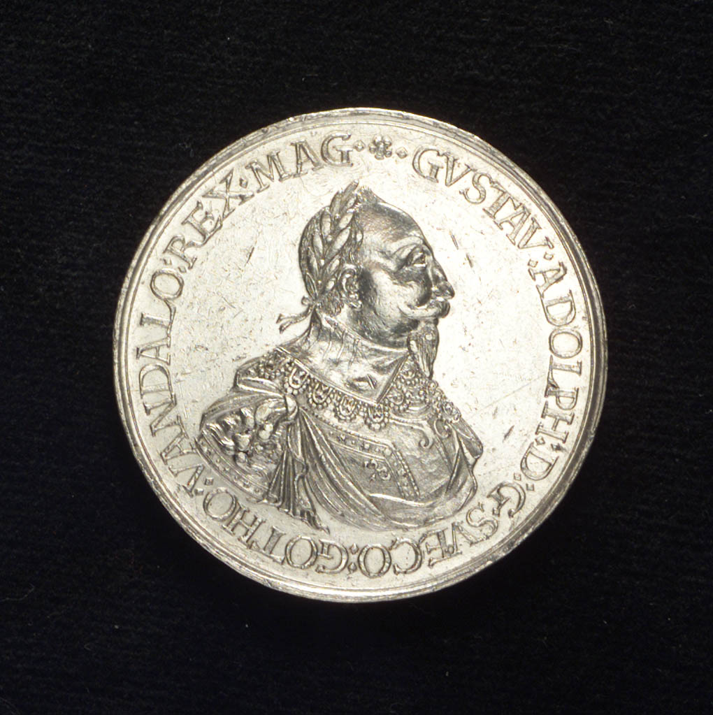 Medal commemorating the landing in Germany, 1630. Medal commemorating the landing in Germany, 1630. Obverse: Bust of King Gustavus Adolphus, laureate, in deep collar and armour (right). Legend: 'GVSTAV . ADOLPH . D . G . SVECO : GOTHO : VANDALO : REX