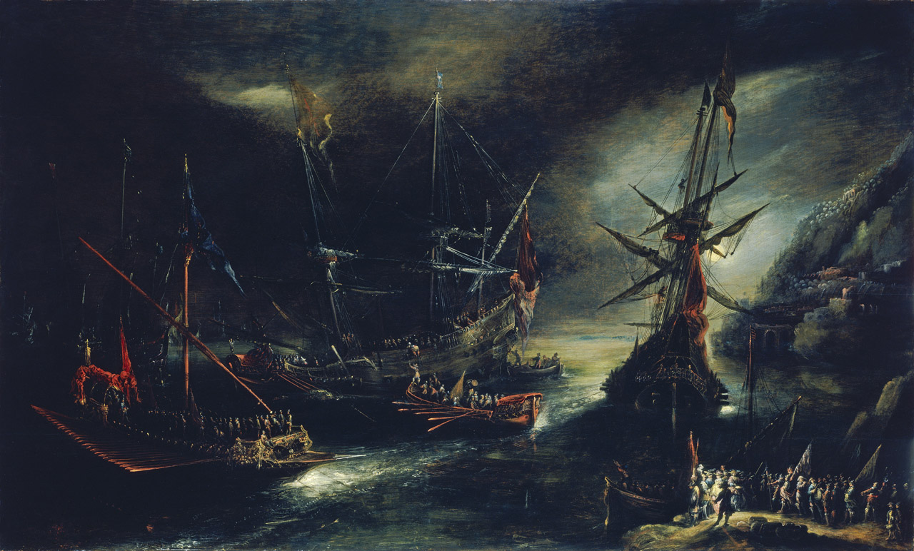 Embarkation of Spanish Troops. This night scene allows van Eertvelt to demonstrate his artistic and dramatic skills. Against bright moonlight, a Spanish fleet prepares to embark from an imaginary Mediterranean coast. On the right the mountainous landscape
