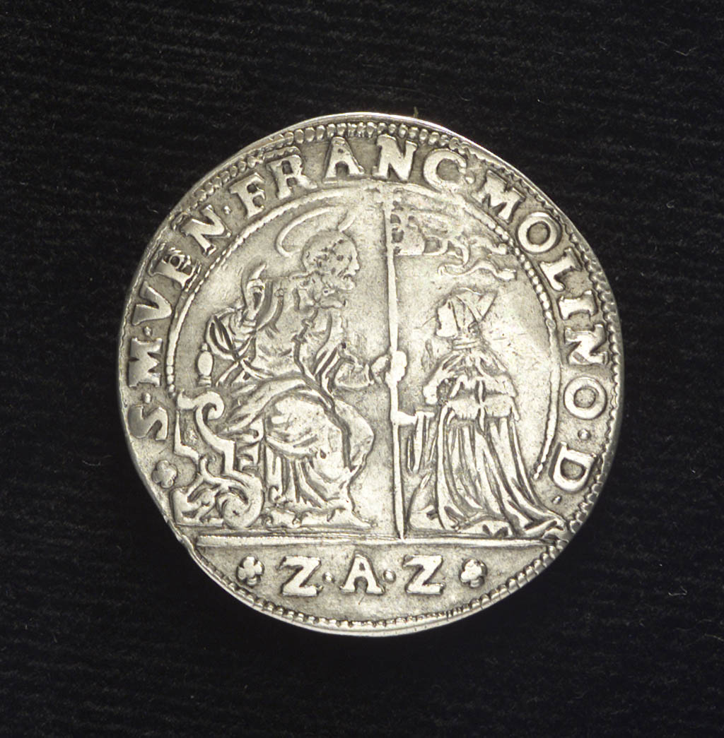 Counter commemorating the naval activity in the Levant, 1647. Counter commemorating the naval activity in the Levant, 1647. Obverse: St Mark seated (left), handing the sacred flag to the Doge kneeling (right). Legend: 'S . M . VEN . FRANC . MOLINO D