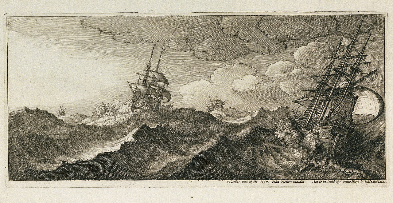 A flute in the trough of a sea and a ship scudding. Technique includes engraving.