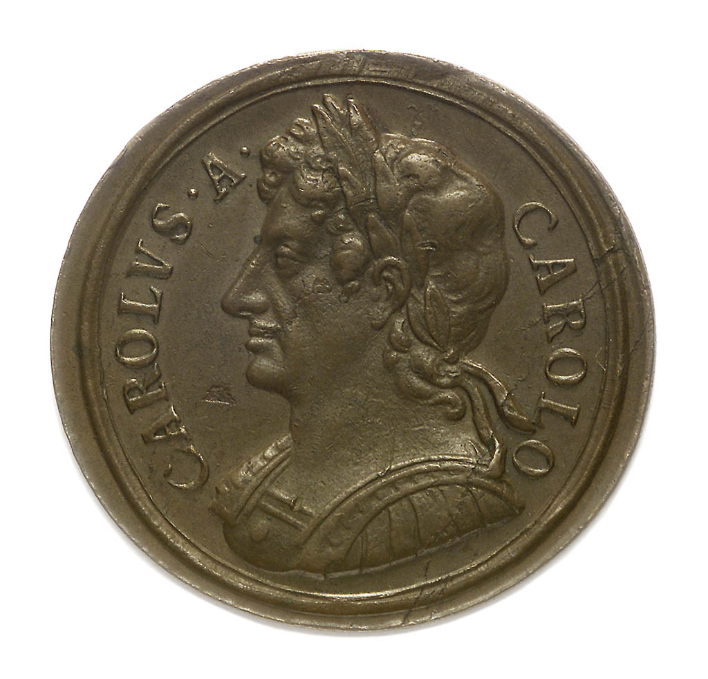 Pattern commemorating the dominion of the sea. Pattern commemorating the dominion of the sea. Obverse: Bust of Charles II (left), laureate, in armour. Legend: 'CAROLVS . A . CAROLO' (Charles of Charles, i.e., son of Charles). Below: '1665