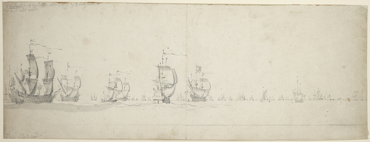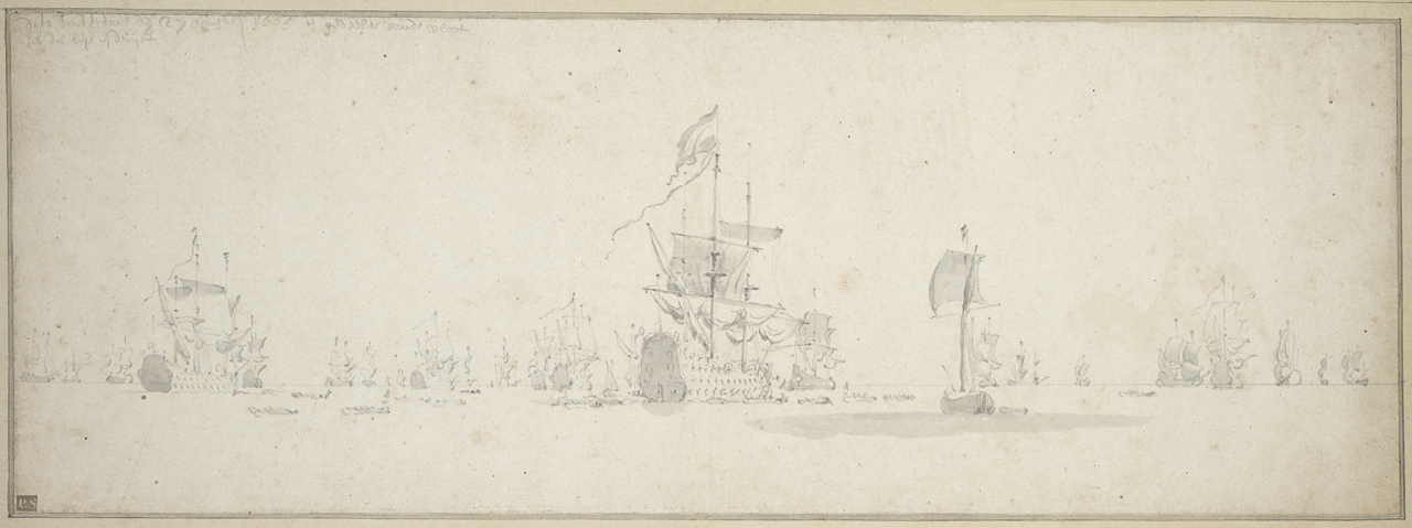 The Dutch fleet before the Battle of Lowestoft, May-June 1665. In this drawing, the Dutch fleet is under easy sail before the wind. In the centre of the drawing is a large ship with a flag and pendant at the main. On the right is a shop with a flag at the