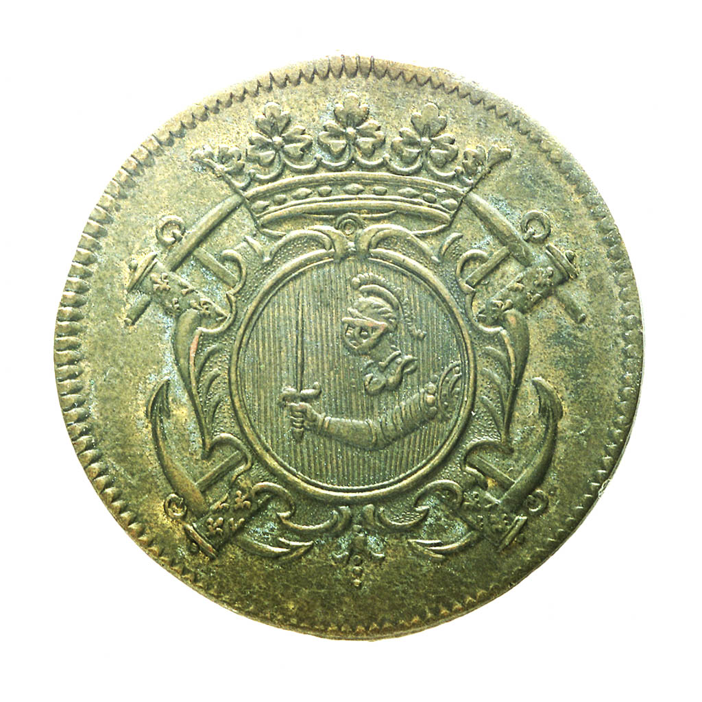 Counter commemorating Admiral de Tourville (1642-1701). Counter commemorating Admiral Anne Hilarion de Contentin, Comte de Tourville (1642-1701). Obverse: Arms of Admiral de Tourville, ducal coronet above, resting upon crossed anchors and batons. Reverse: