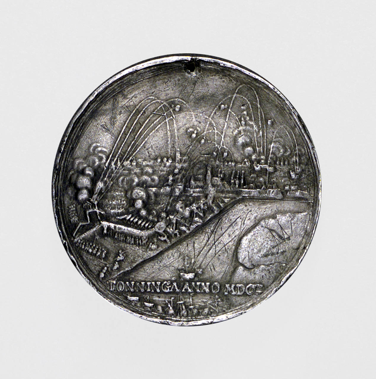 Medal commemorating the bombardment of Tönningen and Copenhagen, 1700. Medal commemorating the bombardment of Tönningen and Copenhagen, 1700. Obverse: Tönningen bombarded, shells bursting. Below: 'TONNINGA ANNO MDCC.' Reverse: A