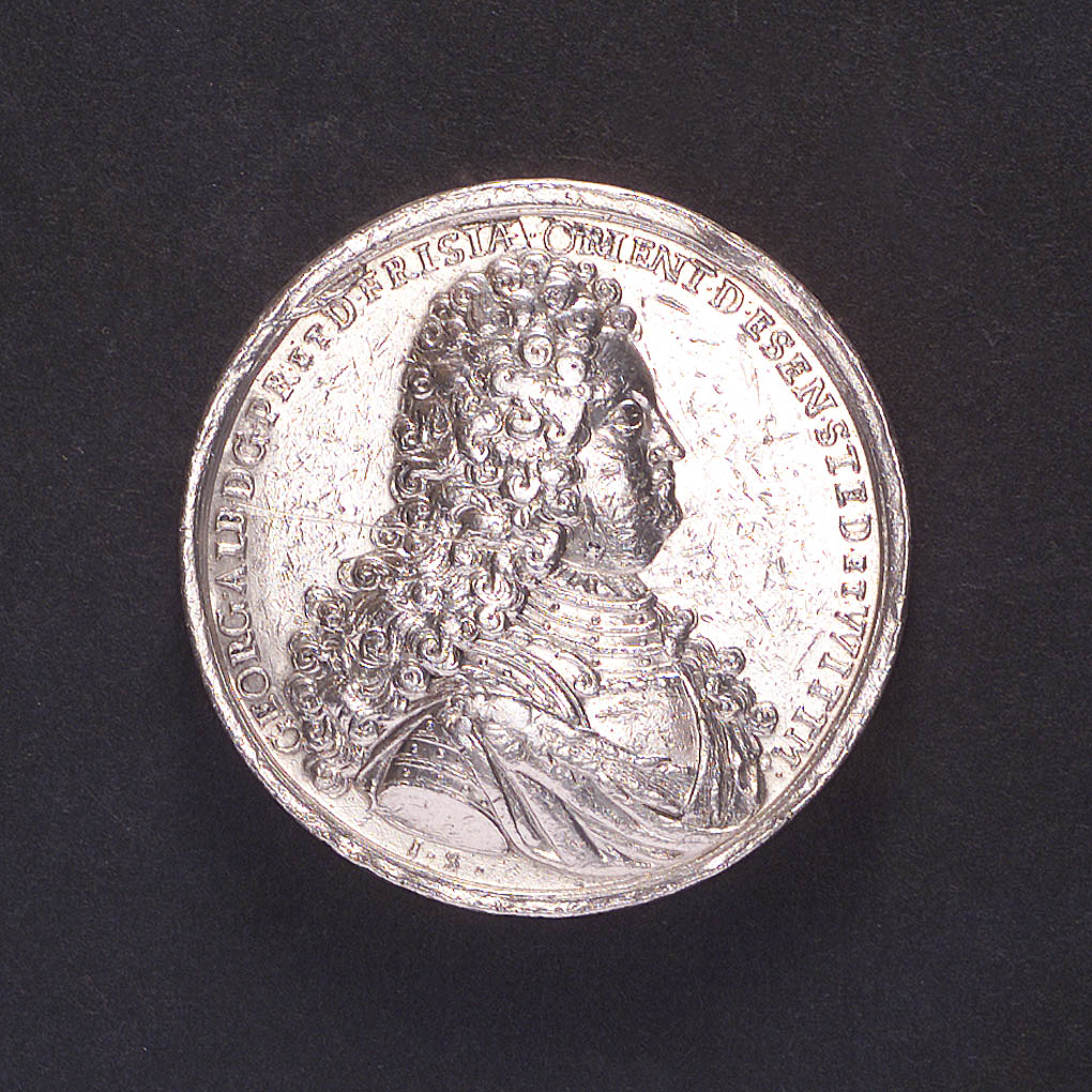 Medal commemorating the attempted invasion of Scotland, 1708. Medal commemorating the attempted invasion of Scotland, 1708. Obverse: Bust of Queen Anne crowned, in a low dress, lovelock on the shoulder, mantle fastened with brooch in front (left). Legend: