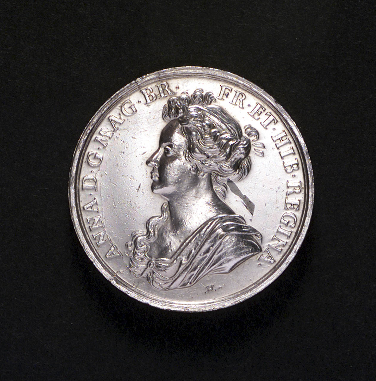 Medal commemorating the attempted invasion of Scotland, 1708. Medal commemorating the attempted invasion of Scotland, 1708. Obverse: Bust of Queen Anne in low dress, hair tied in a knot at the top of the head (left). Legend: 'ANNA . D : G : MAG : BRI