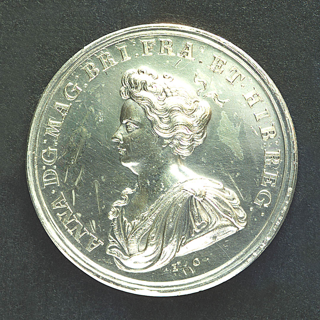 Medal commemorating the attempted invasion of Scotland, 1708. Medal commemorating the attempted invasion of Scotland, 1708. Obverse: Bust of Queen Anne draped, in pearl necklace, gown and mantle (left). Legend: 'ANNA . D : G : MAG : BR : FRA : ET . H