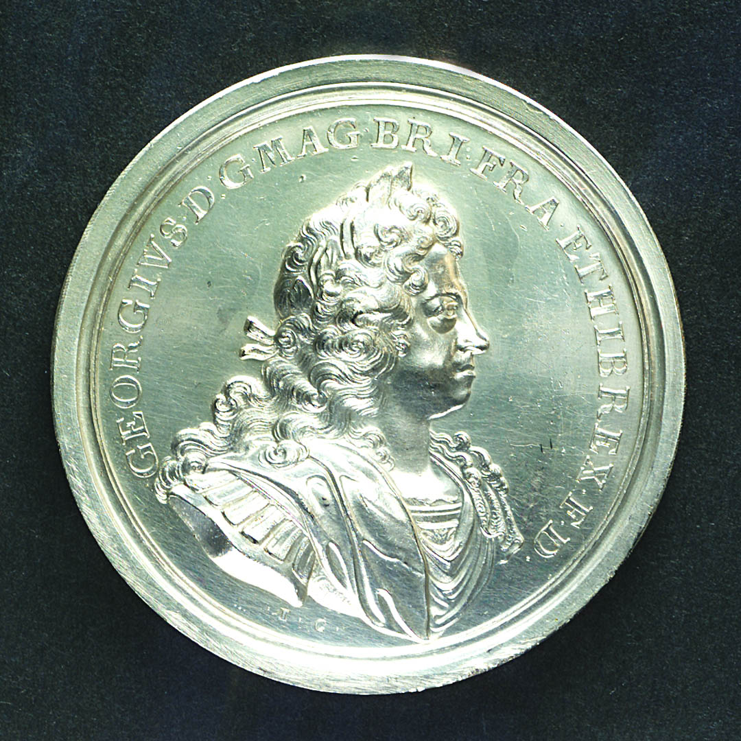 Medal commemorating the arrival of King George I in England, 1714 and dominion of the seas. Medal commemorating the arrival of King George I in England, 1714 and dominion of the seas. Obverse: Bust of King George I in a long wig, armour draped and cloak (