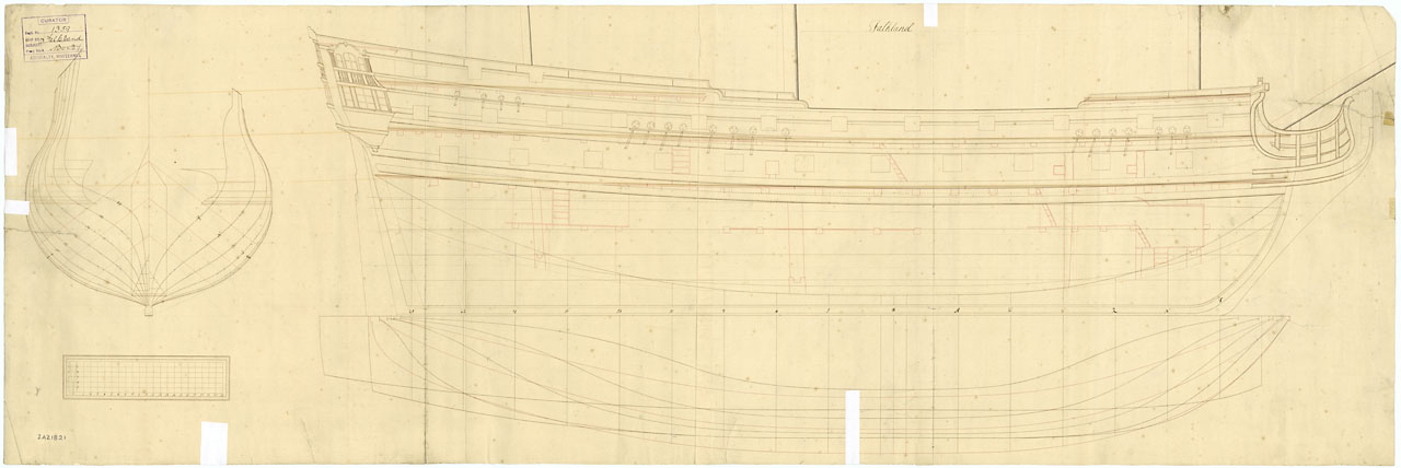 Falkland (1720). Scale: 1:48. Plan showing the body plan, sheer lines with inboard profile, and longitudinal half-breadth for Falkland (1720), a 1719 Establishment 50-gun Fourth Rate, two-decker.