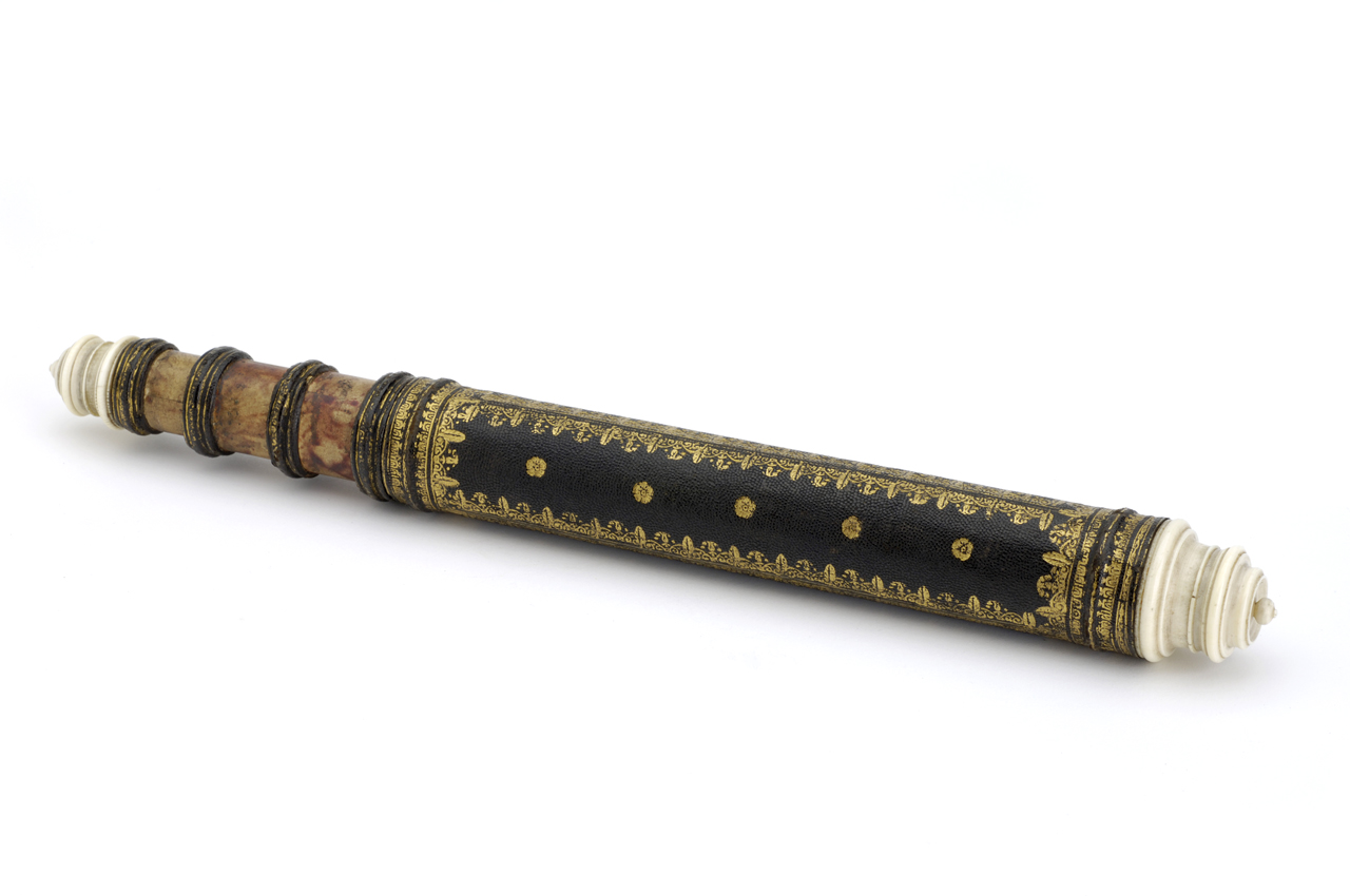 . The barrel of this non-achromatic telescope is covered in sharkskin and is decorated with gold tooling. There are four draw tubes, each covered in marbled paper. Gold-tooled stop lines around the draw tubes indicate the optimum working length of the tel