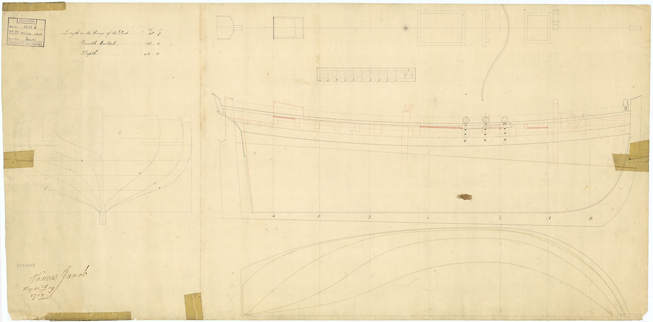 Adventure (1763). Scale: 1:48. Plan showing the body plan, sheer lines with inboard detail, longitudinal half-breadth, and deck plan for Adventure (1763), a purchased single-masted 6-gun Armed Cutter, as fitted at Deptford Dockyard.