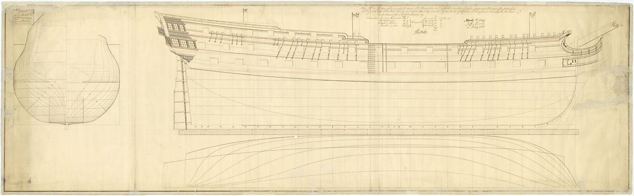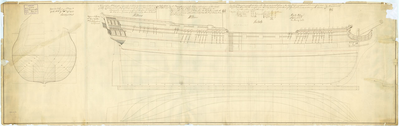 Trident (1768). Scale: 1:48. Plan showing the body plan with sternboard outline, sheer lines with inboard detail, and longitudinal half-breadth proposed (and approved) for Trident (1768), a 64-gun Third Rate, two-decker, to be built at Plymouth. The pla