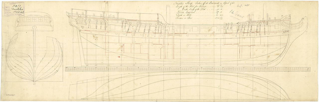 Nautilus (1762). Scale: 1:48. Plan showing the body plan, stern board outline, sheer lines with inboard detail, and longitudinal half-breadth for Nautilus (1762), a 16-gun Ship Sloop, as taken off at Portsmouth Dockyard in April 1763.