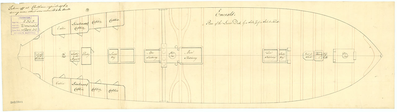 Tartar (1757). Scale 1:48. Plan showing the upper deck and lower deck plans for Tartar (1757), a 28-gun, fifth Rate Frigate as taken off at Deptford Dockyard on 15th April 1763.