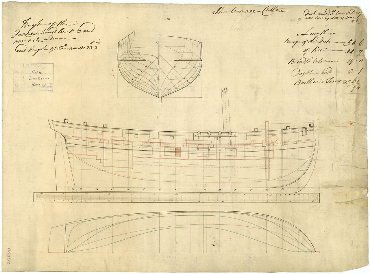 Sherborne (1763). Scale: 1:48. Plan showing the body plan, sheer lines with inboard detail, and longitudinal half-breadth for building Sherborne (1763), a single-masted 6-gun Armed Cutter at Woolwich Dockyard, based on the lines of the purchased Armed Cu