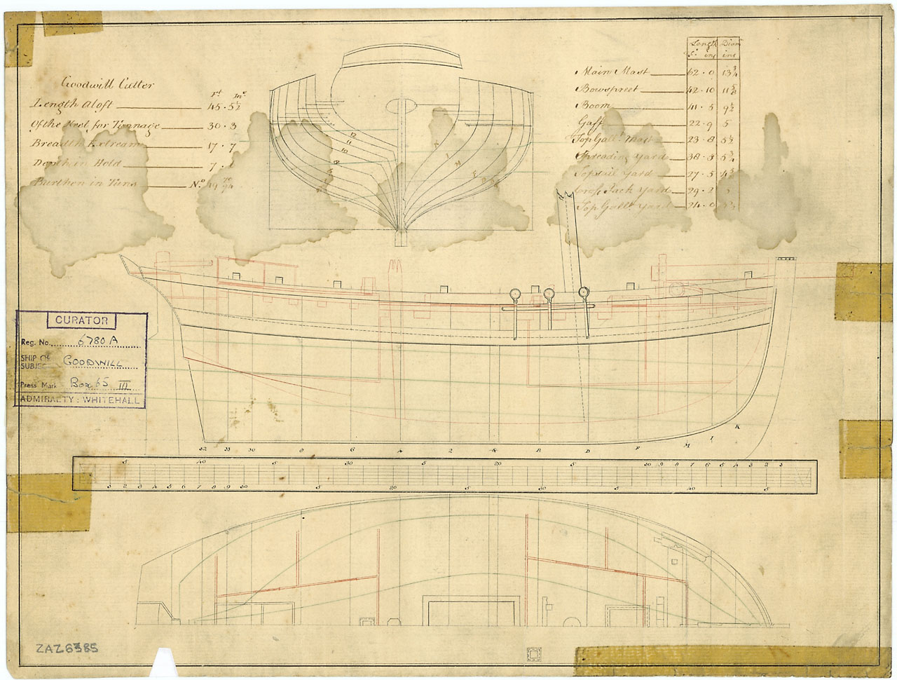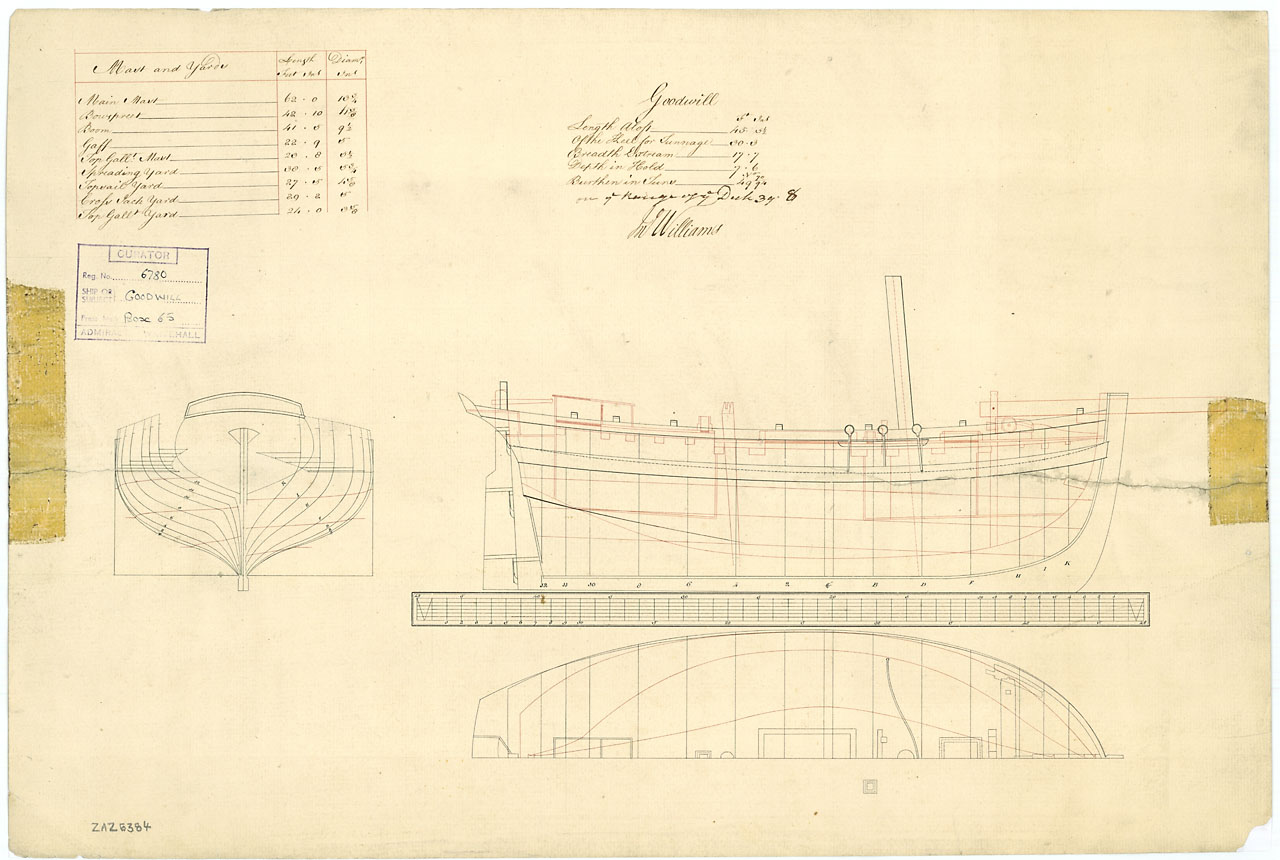 Goodwill (1763). Scale: 1:48. Plan showing the body plan with half stern board outline, sheer lines with inboard detail, and longitudinal half-breadth with deck detail for Goodwill (1763), a purchased single-masted 4-gun Armed Cutter, as taken off at She