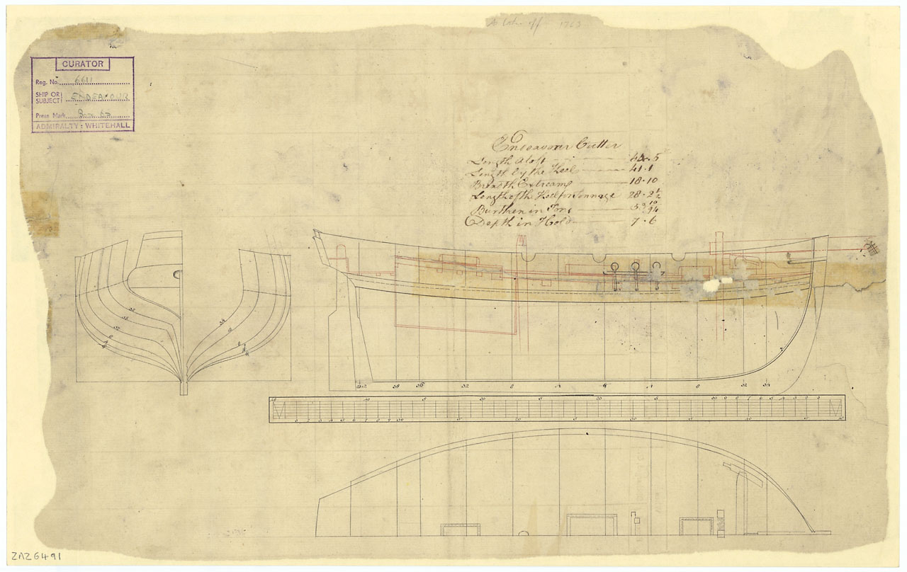 Endeavour (1763). Scale: 1:48. Plan showing the body plan with stern board outline, sheer lines with inboard detail, longitudinal half-breadth, and deck plan with platforms for Endeavour (1763), as fitted as an Armed Cutter.