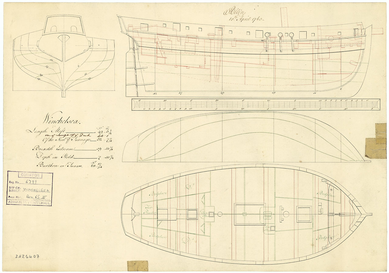 Goodwill (1763). Scale: 1:48. Plan showing the body plan with stern board outline, sheer lines with inboard detail, and longitudinal half-breadth with deck details for Goodwill (1763), a purchased single-masted 4-gun Armed Cutter, as taken off at Sheerne